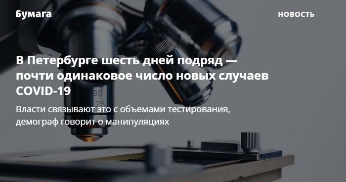 В пресс-службе комитета по здравоохранению Петербурга в ответ на вопрос «Бумаги», связана ли остановка прироста с реальной ситуацией, ответили: «Число заболевших выдает Роспотребнадзор. Эта цифра завязана на объемах тестирования [на коронавирус]». В комздраве также отметили, что число госпитализаций выросло на 7–9 %.