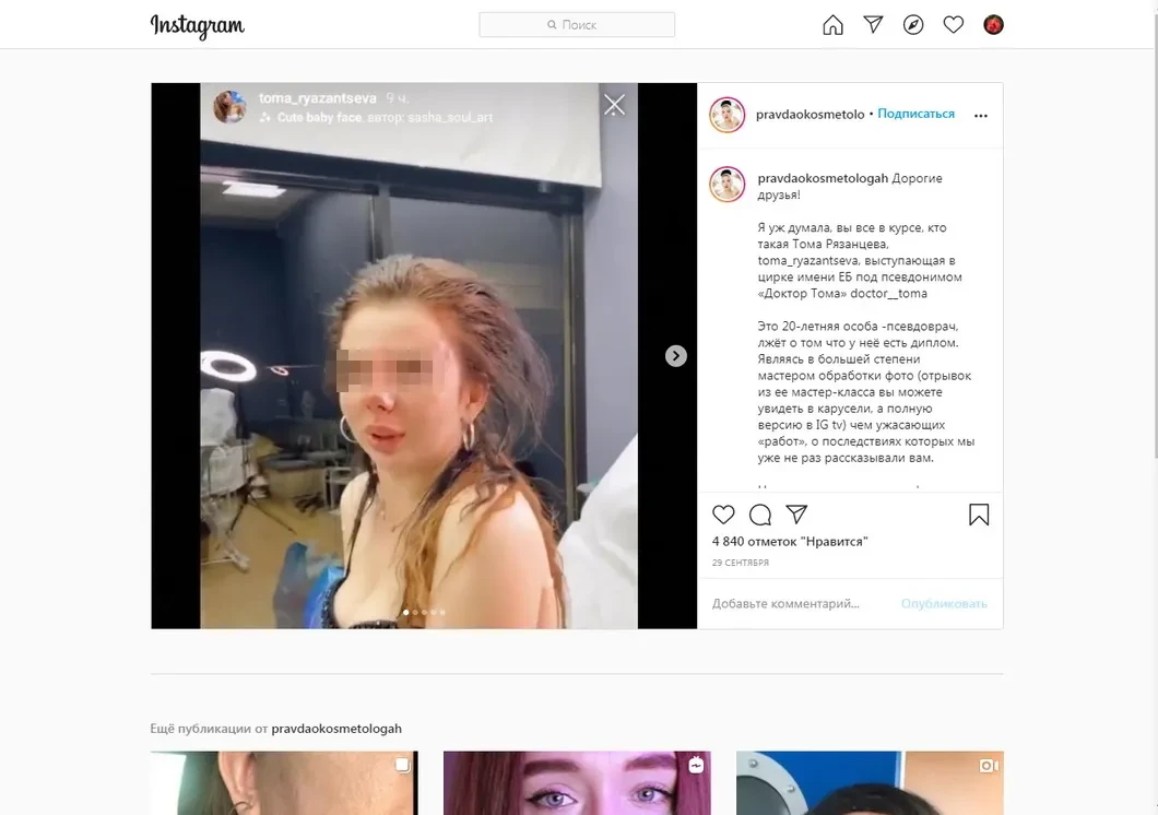 «Доктор Тома называет себя врачом, при этом ей 20 лет, какой врач? — отмечает администратор проекта «Правда о косметологах», общественница Стэлла Арагонская. — Никто ее диплом не видел, но каким-то образом она попала в подборку пластических хирургов журнала Cosmopolitan (речь идет о статье «Ходячая реклама: самые красивые пластические хирурги из «Инстаграма», на момент написания материала Рязанцеву из этого списка удалили. —*Ред.)*. Это просто шапито-шоу с самым большим размахом».