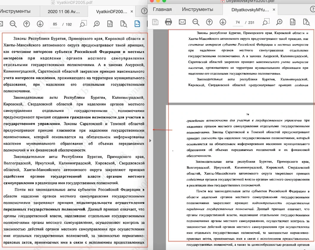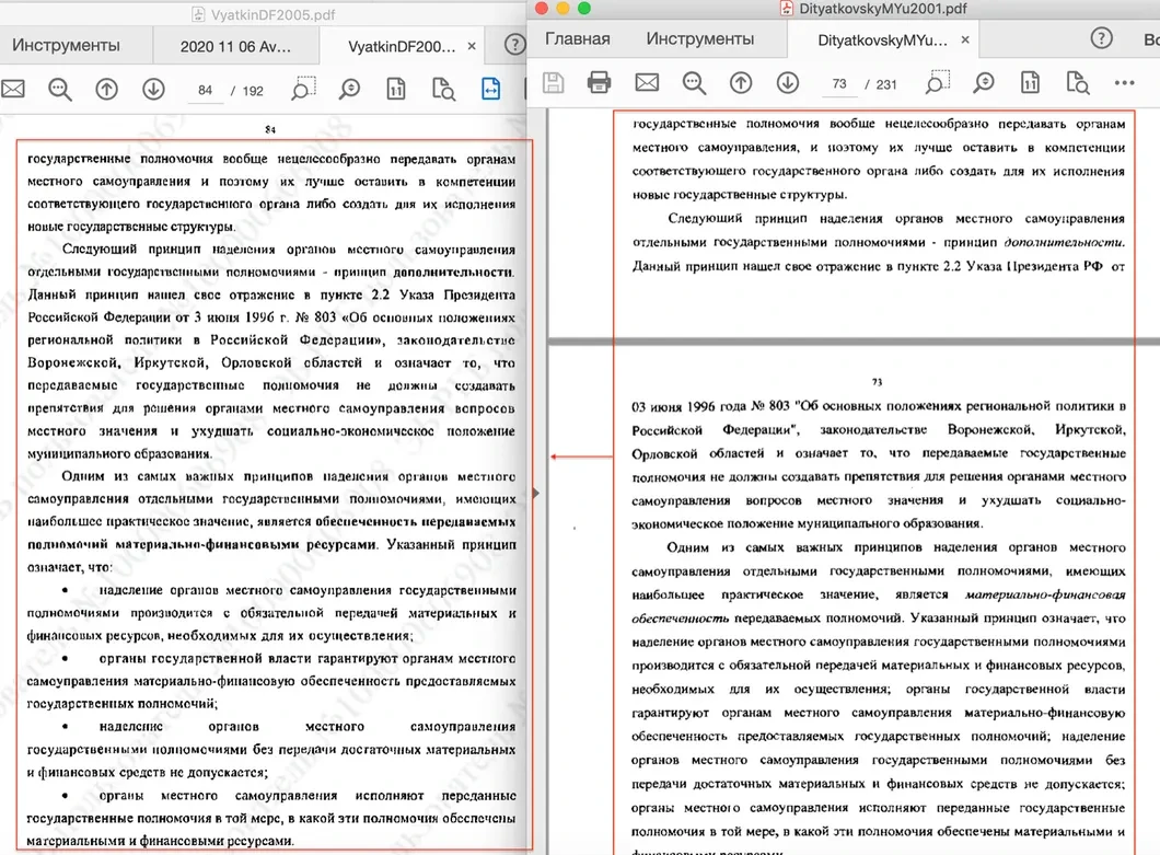 Неспешно продвигаясь по кириллице, я дошел до букв «Вя». В диссертации депутата Дмитрия Федоровича Вяткина я обнаружил фрагменты, очень похожие, на мой взгляд, на научную работу омского чиновника Михаила Дитятковского. В отсутствии кавычек и ссылок вы можете убедиться, посмотрев на иллюстрации. Как ни в чем не бывало в диссертации как бы Вяткина очень странно открывается раздел «Принципы наделения органов местного самоуправления отдельными государственными полномочиями» (стр. 82–86).