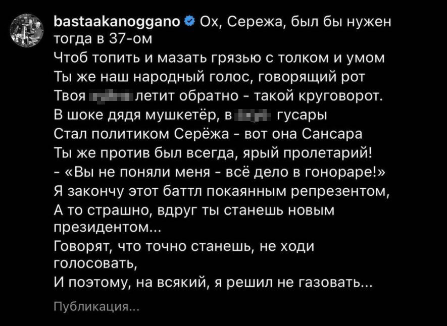 Последним в импровизированном батле стал пост Басты с новым стихотворением и словами «Прости меня, Сережа, был не прав».
