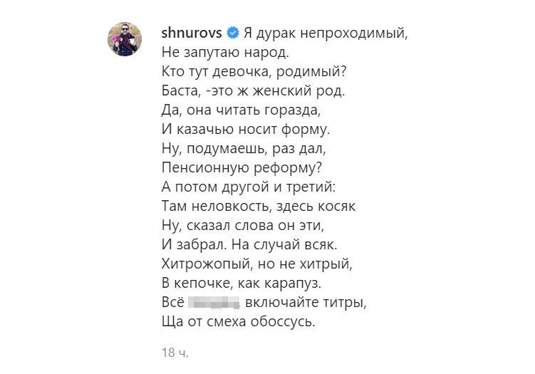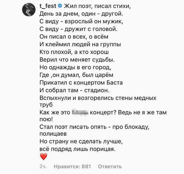 В ответ на ситуацию с концертами лидер группы «Ленинград» Сергей Шнуров написал в своем инстаграме короткое сатирическое стихотворение. В нем он сравнил Басту с «полицаем».