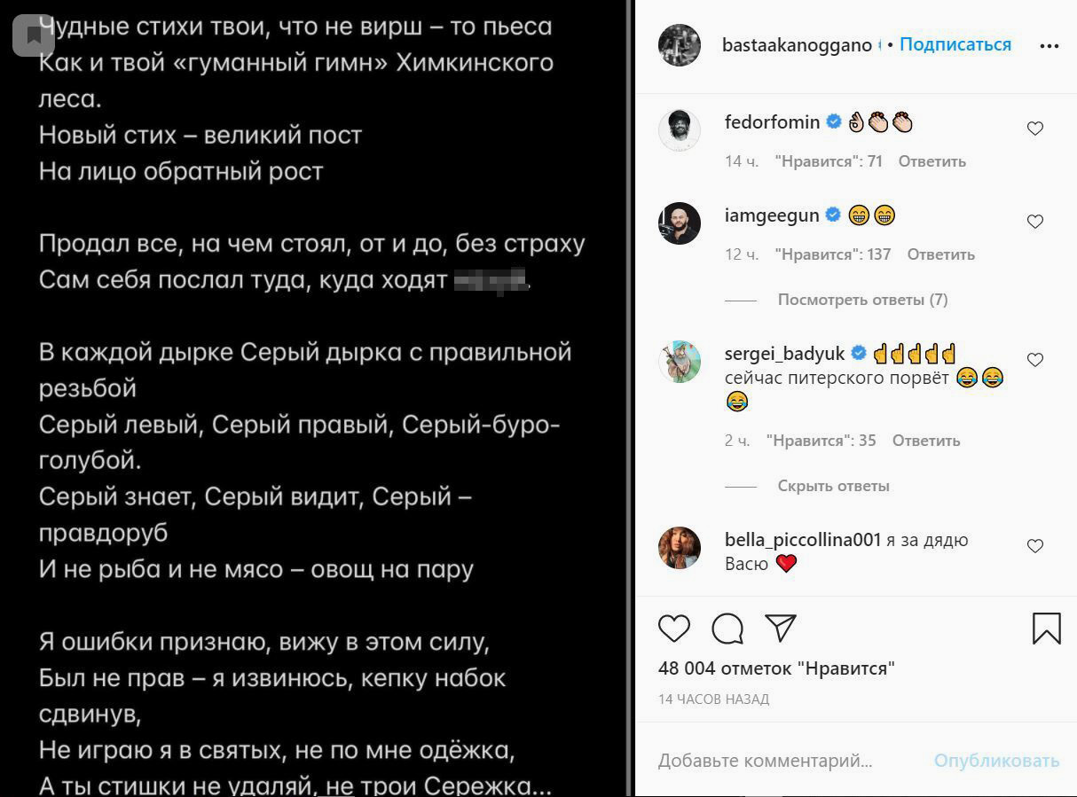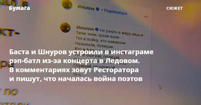 Спустя час Шнуров опубликовал скриншот новости об ответе Басты и приложил к нему новое стихотворение. После этого между музыкантами начался настоящий текстовый батл в инстаграме.