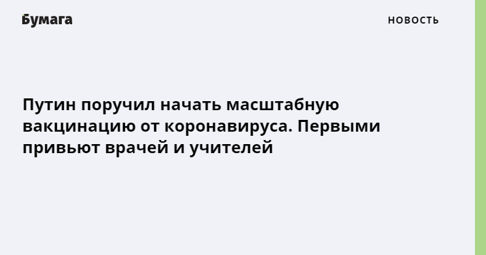 В России произвели около 2 миллионов доз вакцины от коронавируса, что позволяет начать «если не массовую, то масштабную вакцинацию», говорит Путин. Первыми привиться смогут врачи и учителя, так как они входят в группу риска.