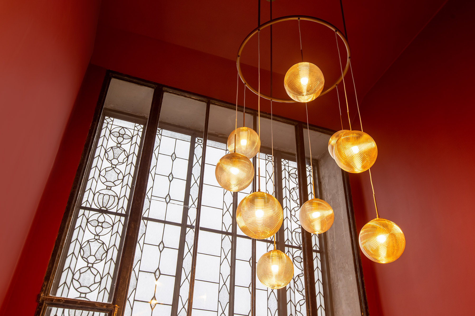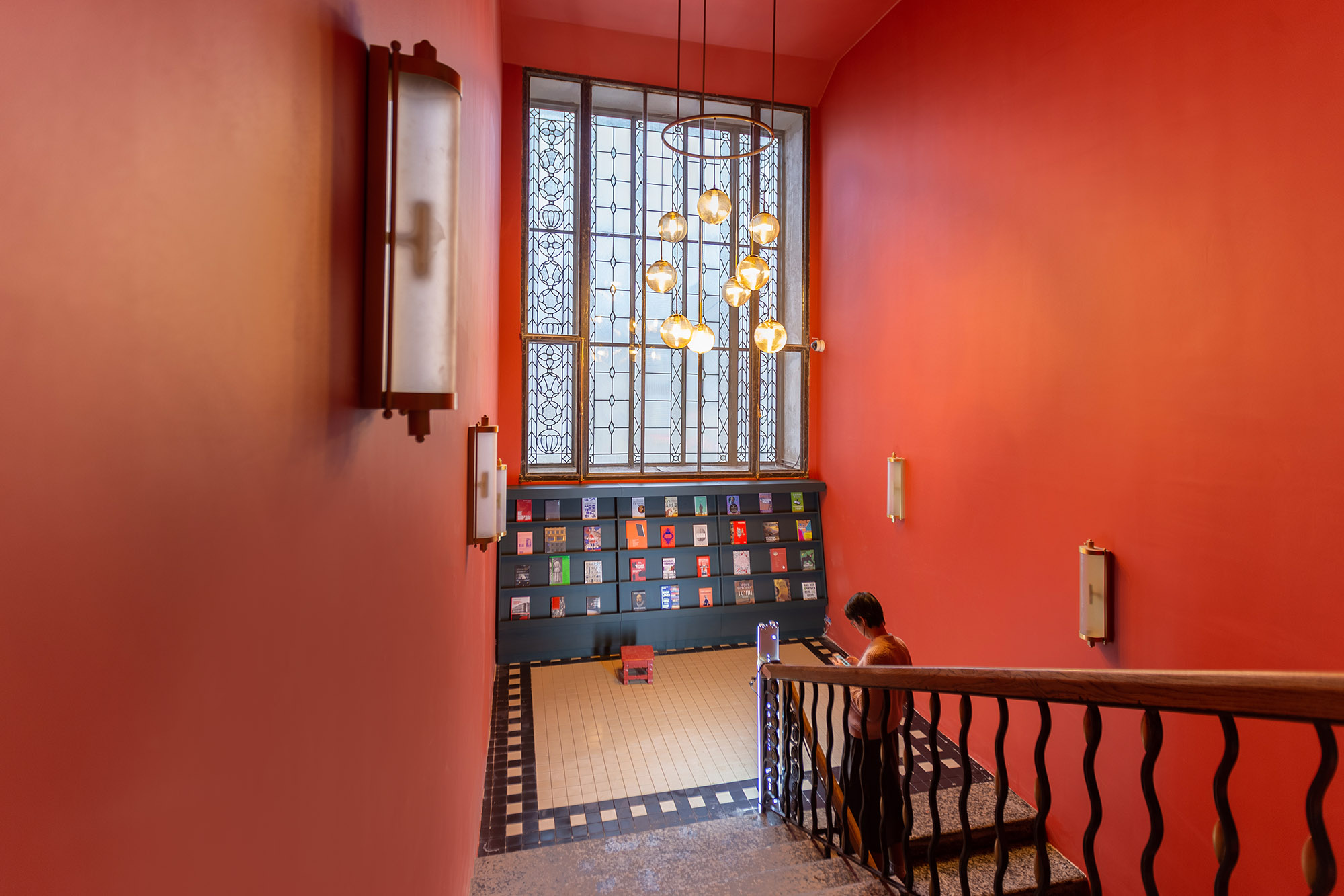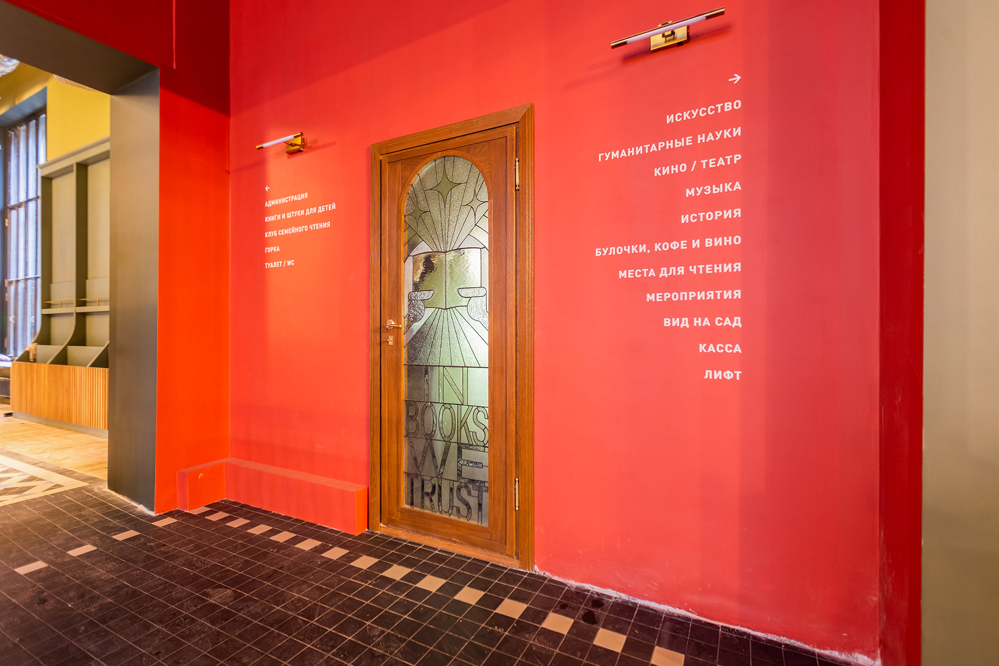 Сейчас подняться на второй этаж можно по лестнице (позже ее украсят плакатами и картинами). Наверху гостей встречает дверь с витражом и надписью In Books We Trust от бюро «Дело Контура». Витражей на втором этаже довольно много: другие декоративные объекты украшают большие окна на Литейный проспект.