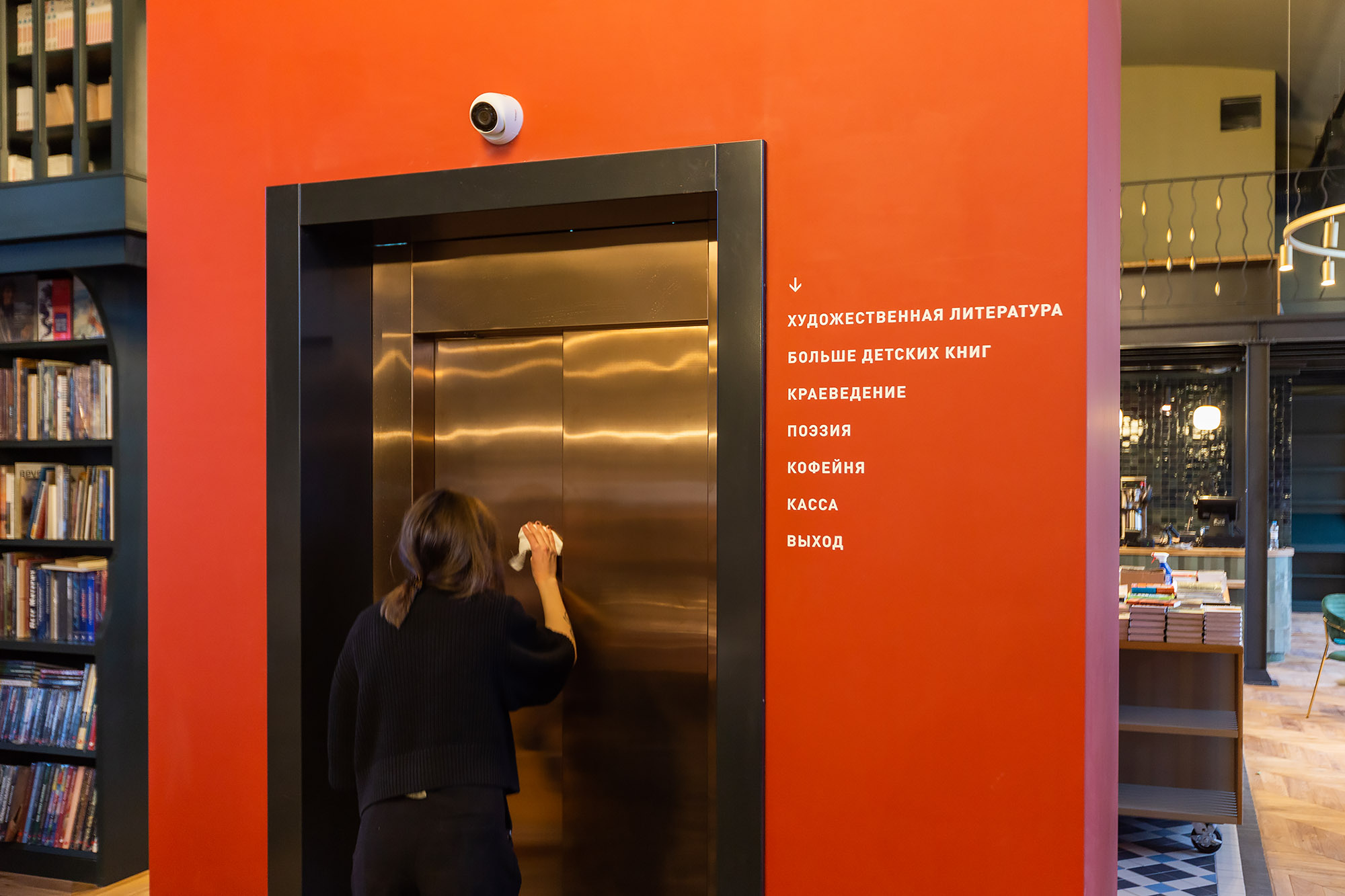 Слева — еще не полностью законченное семейное пространство с деревянной детской горкой. Зал уже работает, а позднее здесь организуют семейный клуб: покупатели смогут оставить детей, присматривать за ними будет штатный педагог. В этой же части магазина находятся туалеты — один из них приспособлен для посетителей с колясками и маленькими детьми. Для маломобильных гостей «Подписных» предусмотрен и лифт — шахту в здании проложили еще в советское время, тогда по ней перевозили книги.