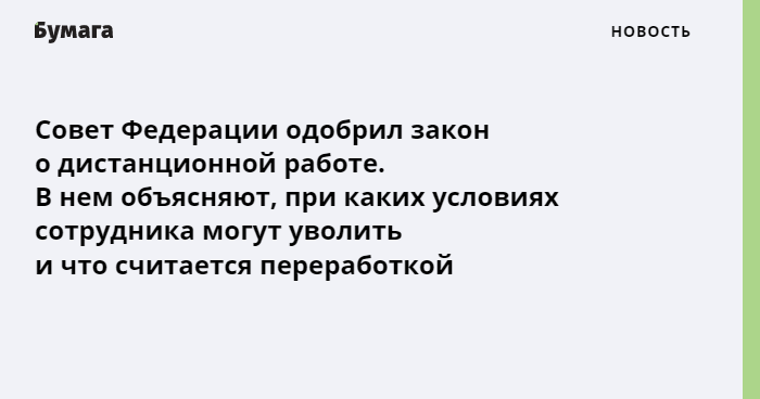 Совет Федерации одобрил закон о дистанционной, временной и комбинированной удаленной работе. Он вступает в силу 1 января 2021 года. Об этом сообщают «Интерфакс» и «РИА Новости».