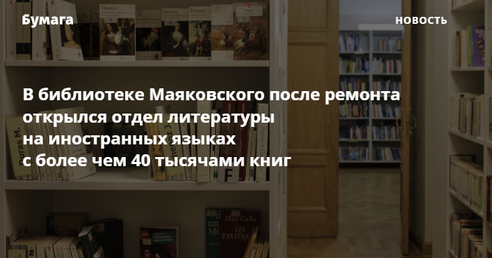 В библиотеке Маяковского в полном формате заработал отдел литературы на иностранных языках — там завершился ремонт. Об этом сообщается в социальных сетях учреждения.