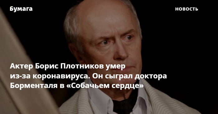 Умер актер Борис Плотников, сыгравший доктора Борменталя в «Собачьем сердце». Ему был 71 год. По предварительной информации, у артиста остановилось сердце pic.twitter.com/HC7snICd5x
