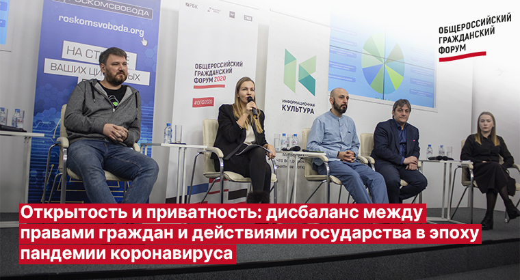 В первом нашем материале о дискуссиях на площадке «Право на приватность и открытость» в рамках Общероссийского гражданского форума — эксперты «Роскомсвободы» и «Информационной культуры» поделились мнениями о балансе между приватностью и открытостью, эффективностью слежки государства за гражданами во время пандемии, шагах к доверию по отношению к государству, «вируспруденции» и многом другом.