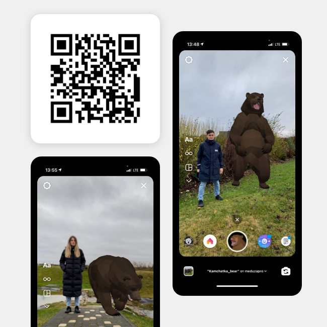 Хотите оценить, насколько медведи большие? Попробуйте фильтр «Медузы» в инстаграме. Если вы читаете материал с телефона, перейдите по этой ссылке (нужно установленное приложение Instagram). Если с компьютера — наведите камеру телефона на QR-код ниже.