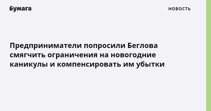 Межотраслевой координационный совет гостеприимства и услуг Петербурга, в который входят городские отельеры, туроператоры и рестораторы, попросили губернатора Александра Беглова смягчить коронавирусные ограничения на новогодние каникулы и компенсировать бизнесу потери от принимаемых властями мер. Об этом говорится в письме совета, которое есть в распоряжении «Бумаги».