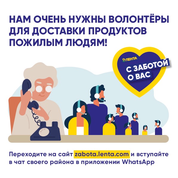 Сеть магазинов «ЛЕНТА» обрабатывает заявки от пожилых людей из Санкт-Петербурга, Екатеринбурга и Новосибирска. Еду доставляют волонтеры, которые ежедневно откликаются на заявки и собирают заказы. Многие сотрудники магазинов сами стали волонтерами.