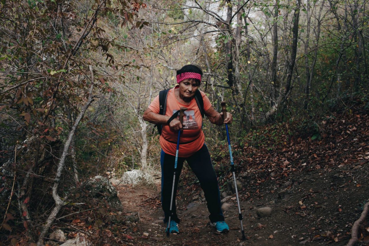 Во время подъема приходится зашагивать на крупные скользкие камни. Альпинистка опирается на палки и аккуратно перемещает больную ногу. Она не останавливается на отдых, лишь иногда замедляется, чтобы решить, куда удобнее ступить. На вопрос о боли отрицательно мотает головой.