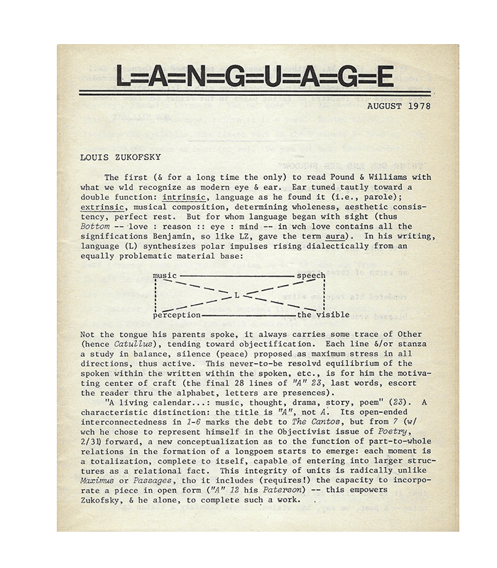 Как мы видим из приведенного выше отрывка, граница между поэзий и прозой истончилась. Поэтами «школы языка» была предложена новая форма организации поэтического текста: Рон Силлиман, один из представителей движения, выдвинул «новое предложение» как основную форму для создания стихов в рамках языковой поэзии. Новое предложение, написанное с поэтической интонацией и намеренными синтаксическими нарушениями, эту интонацию создающими, противопоставлено классическому делению стиха на строки: предложение здесь становится особой структурой, в рамках которой смысл передается за счет ассоциативных связей, обнаженных впоследствии с помощью синтаксических преобразований в тексте.