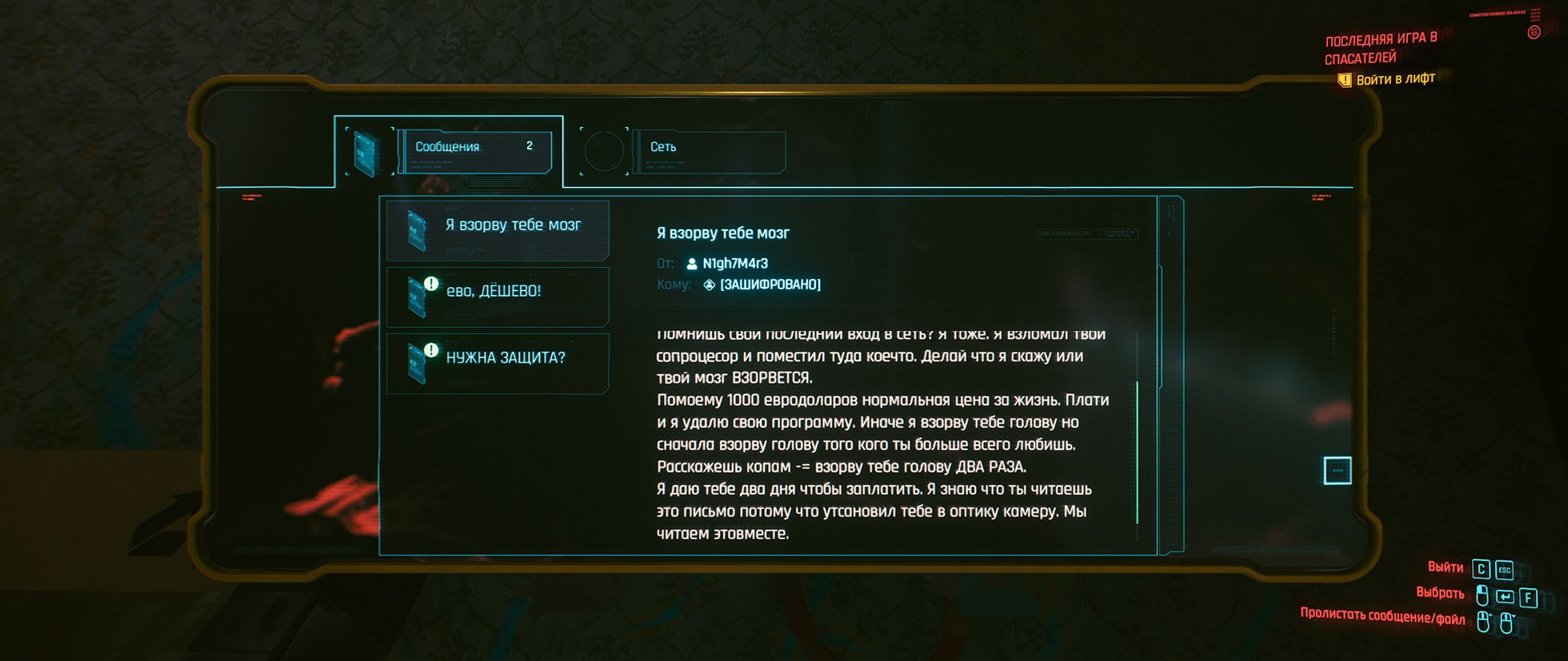 К этому моменту выясняется, что мир проработан так хорошо, что ужасно интересно задавать все дополнительные вопросы в диалогах, читать найденные записки и копаться в чужих имейлах. В почте, например, много уморительного спама об увеличении члена и нелепых угроз от кибермошенников — с 2020 года мало что изменилось.