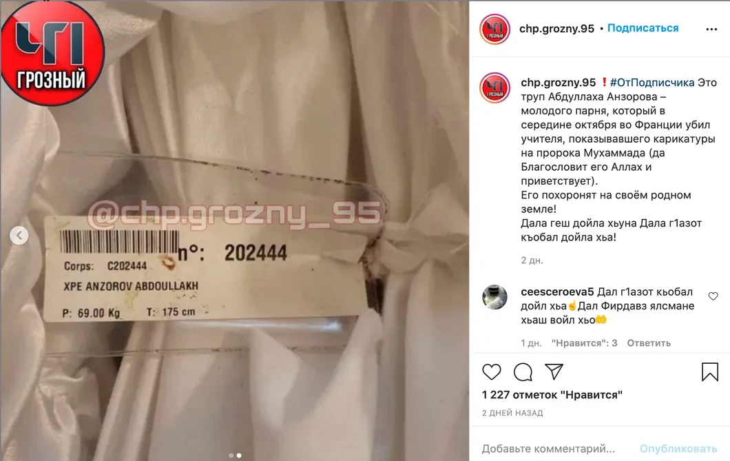 В субботу на провластных чеченских аккаунтах в инстаграме появилась информация о том, что из Франции в Чечню доставлен труп 18-летнего этнического чеченца Абдуллы Анзорова, который 17 октября в парижском пригороде Конфлан-Сент-Онорин зарезал школьного учителя истории Самюэля Пати. После убийства Анзоров в лучших традициях ИГИЛ (запрещенная в России террористическая организация.— Ред.) выложил в собственный твиттер фотографию отрезанной головы учителя. Таким диким образом молодой парень расправился с совершенно незнакомым ему человеком, который, как где-то в интернете прочел Анзоров, якобы оскорбил пророка Мухаммада. В ходе задержания Анзоров отказался подчиниться требованиям сотрудников французской полиции и был застрелен.