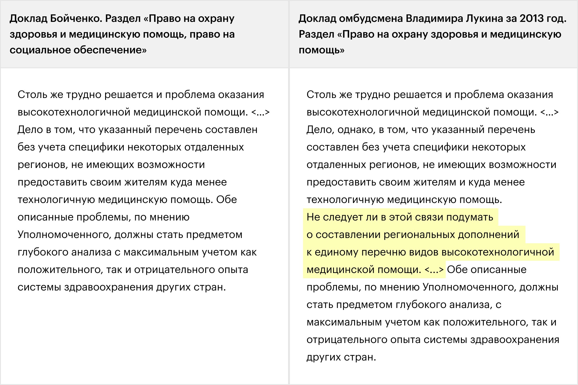 Сравнение отрывка из доклада Ларисы Бойченко за 2019 года и из доклада Владимира Лукина за 2013 год. Цветом выделены отличающиеся фрагменты.