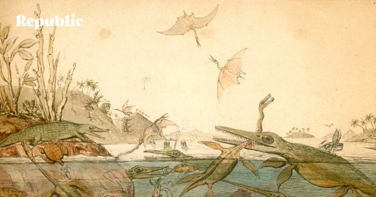 Одно из ранних научных изображений динозавров: акварель английского палеонтолога Генри Томаса де Беша «Древнейший Дорсет» (1830). Наш общий предок с динозаврами (и всеми живыми организмами в истории Земли) жил около 4 млрд. лет назад