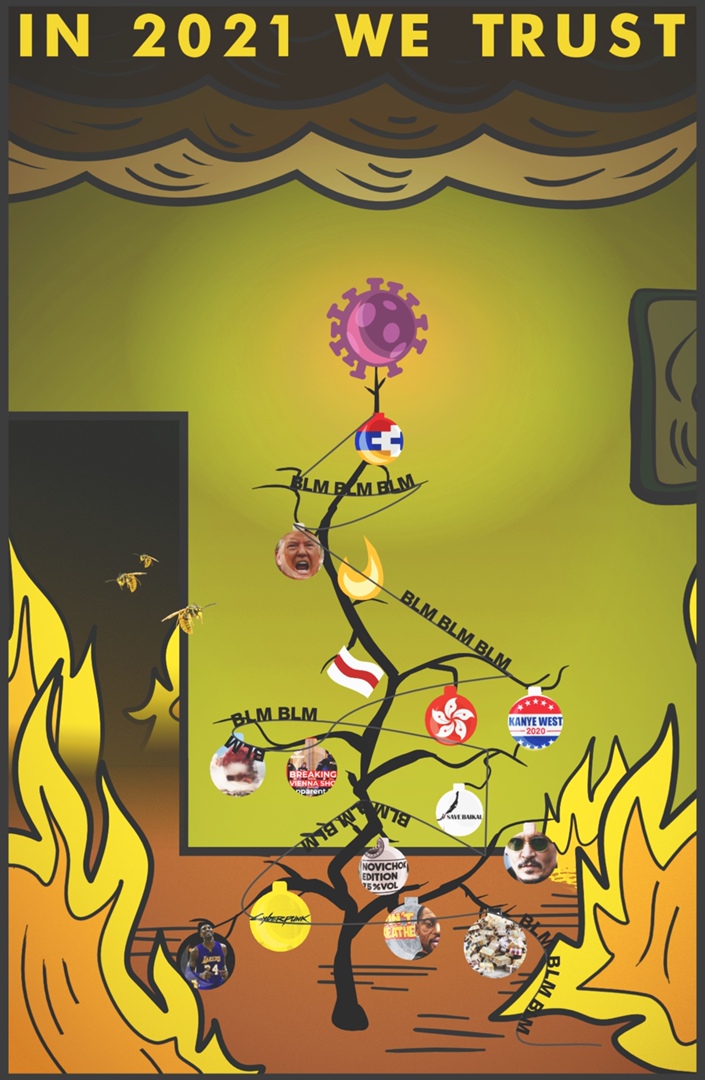 Обгоревшая елка с «игрушками», отображающими события 2020-го, иллюстрирует настроение, с которым интернет провожает этот год.