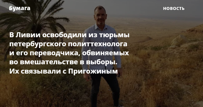 В Ливии выпустили на свободу петербургского политтехнолога Максима Шугалея и его переводчика Самера Суэйфана, которые работали в «Фонде защиты национальных ценностей». Об этом пишет «Интерфакс» со ссылкой на главу фонда Александра Малькевича.