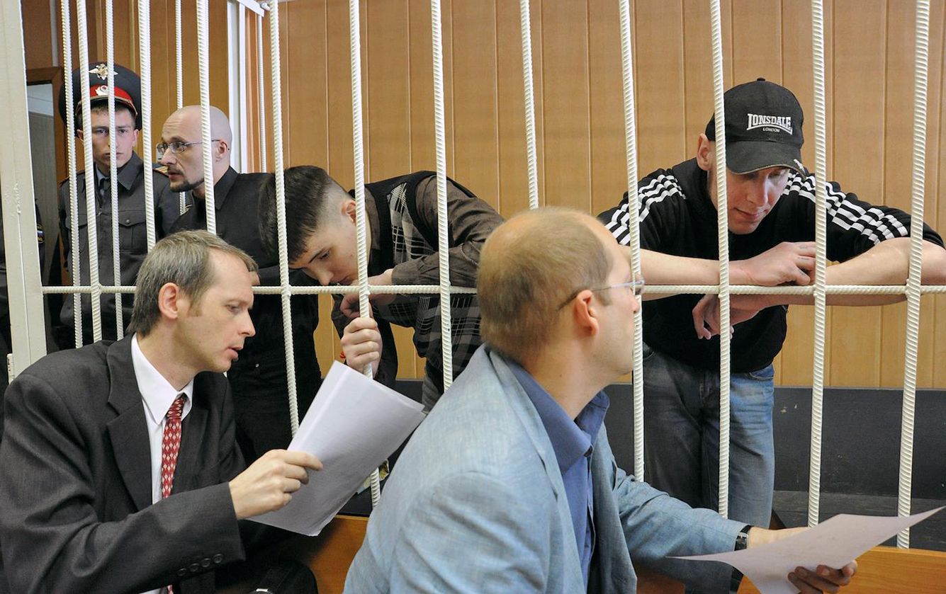 Светлана Привалова / Коммерсантъ За решеткой, слева направо: Руслан Хубаев, Кирилл Унчук и Игорь Березюк во время заседания Тверского суда.
