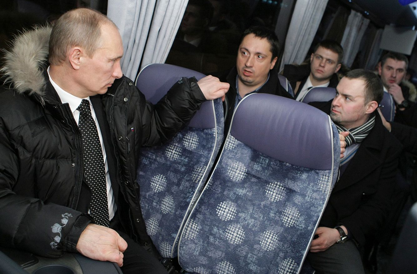 Scanpix / LETA Владимир Путин и Александр Шпрыгин (слева у окна) в автобусе по пути на кладбище к могиле Егора Свиридова