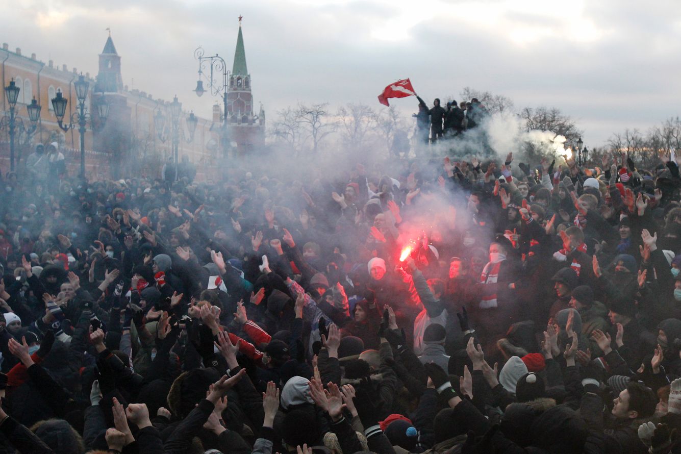 10 лет назад, 11 декабря 2010 года, на Манежной площади Москвы, у стен Кремля тысячи людей собрались на стихийный митинг памяти болельщика «Спартака» Егора Свиридова. Они требовали объяснить, почему милиция сразу после задержания отпустила предполагаемых убийц Свиридова. Акция быстро перешла в столкновения: люди скандировали «Русские — вперед!», дрались с силовиками, били прохожих. А через десять дней после событий на Манежной с лидерами футбольных фанатов встретился премьер Владимир Путин, вместе с ними возложивший цветы на могилу Свиридова. Возможно, именно поэтому «Манежка» запомнилась многим как акция футбольных фанатов. На самом деле это был, скорее, «правый» бунт, а самые большие сроки за участие в нем получили члены запрещенной Национал-большевистской партии. Спустя 10 лет спецкор «Медузы» Максим Солопов поговорил с двумя из осужденных нацболов, лидером футбольных болельщиков, полицейским оперативником и фотожурналистом — о беспорядках на Манежной, о встрече фанатов с Путиным и о том, чем все это обернулось для участников событий.