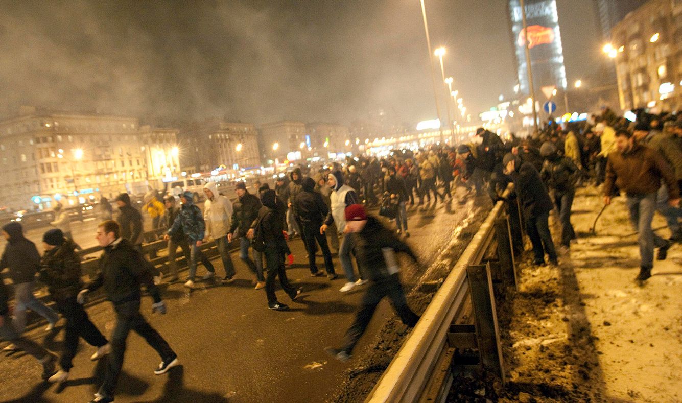 Вначале они просто митинговали, жгли файеры, кричали, потом… Я не видел сам момент избиения, которое происходило под Охотным рядом. Я даже не уверен, мои ли это были кадры, когда ребят избивали, потому что со мной был еще корреспондент с камерой. Скорее всего, как раз избиение сподвигло всю толпу двинуться ближе к Манежу, где, собственно, происходили основные столкновения с ОМОНом. Я помню, что все куда-то ринулись. Со мной рядом проходил чувак, один из митингующих, у него был пистолет. Я не знаю, травмат или нет, но скорее травмат. Ребята были заряжены.