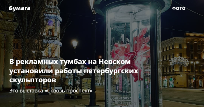 В прозрачных рекламных тумбах на Невском установили арт-объекты, которые выполнили петербургские скульпторы Александр Кит, Семен Платонов и другие. Фотографии уличной выставки «Сквозь проспект» опубликовал один из авторов.