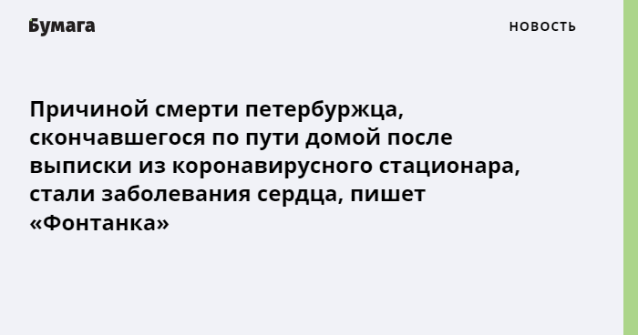 Причиной смерти мужчины, который скончался по пути домой из больницы после лечения от коронавируса, стали заболевания сердца. Об этом пишет «Фонтанка» со ссылкой на источник, близкий к следствию.
