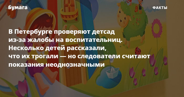В частности, по словам источника, один из детей сказал, что его «пальцем теребили за пенис, как колокольчик». Другой ребенок частично повторил это — но, как говорит собеседник «Бумаги», позже его родители обратились к следователям с опровержением. По их словам, ребенок признался, что «нафантазировал».