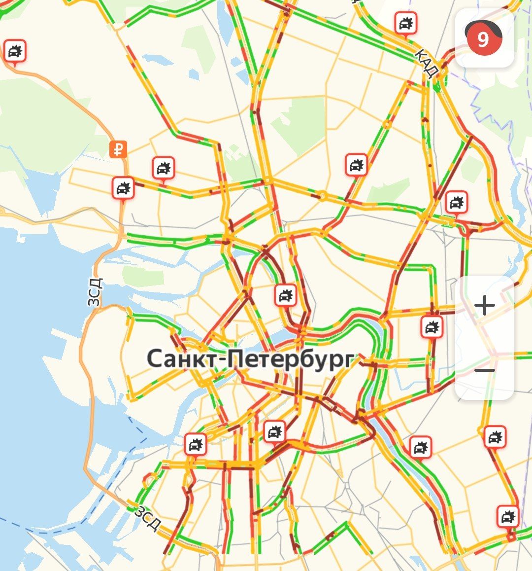 Вечером 11 декабря в Петербурге образовались 9-балльные пробки. Это следует из данных сервиса «Яндекс.Карты».