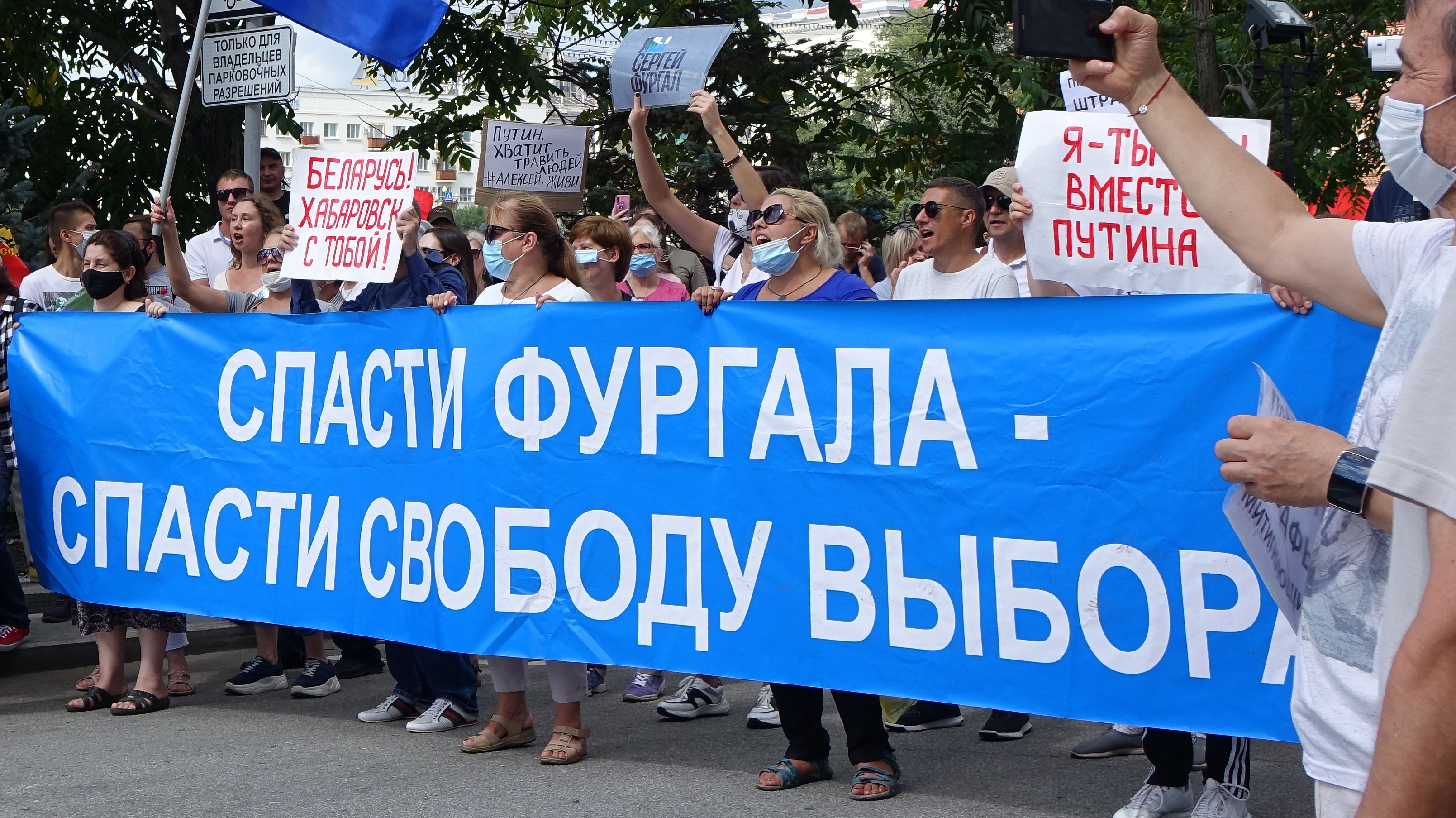 - Протесты в Хабаровске продолжаются почти пять месяцев. Активисты требуют справедливого разбирательства дела экс-губернатора Сергея Фургала. Поскольку власть не отреагировала на массовые протесты, жители стали выдвигать политические требования, в том числе отставки президента Владимира Путина.