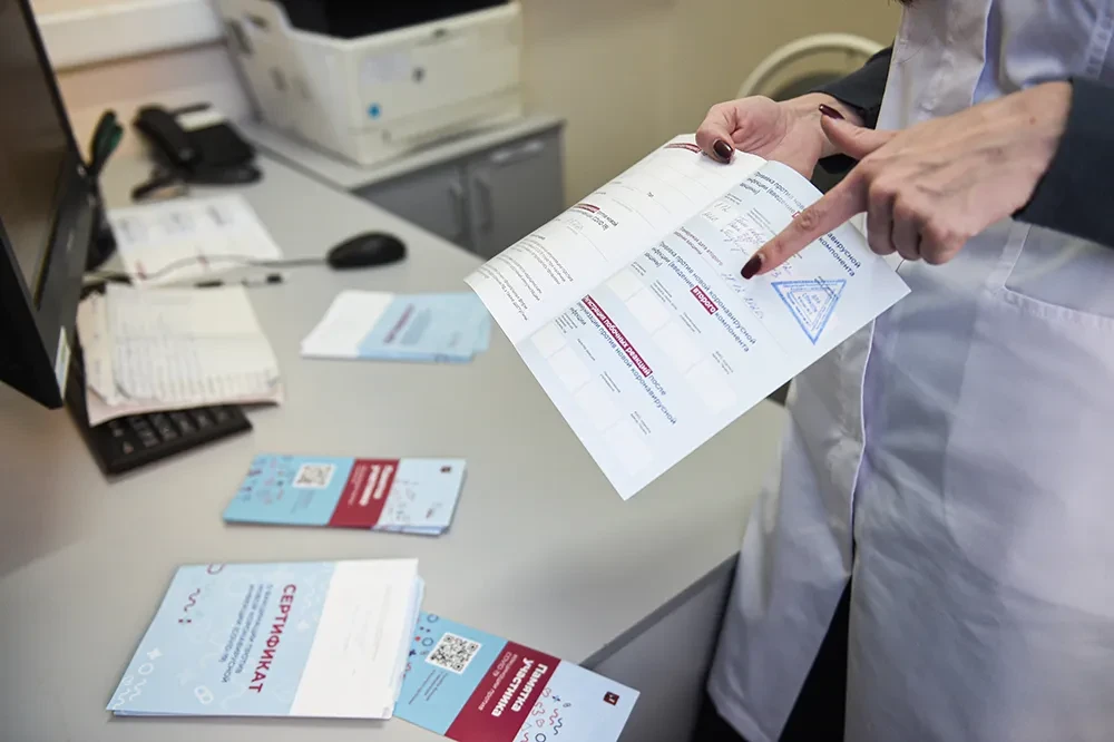 Медицинский работник демонстрирует назначенную пациенту дату повторной прививки от коронавируса COVID-19. Фото: Imago images/Xinhua