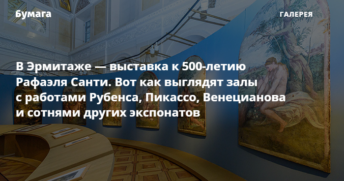 Эрмитаж открыл выставку «Линия Рафаэля» в нескольких залах Зимнего дворца. Экспозиция, приуроченная к 500-летию влиятельнейшего художника Нового времени, исследует его влияние на других европейских авторов: маньеристов, академистов, караваджистов, модернистов и мастеров барокко.