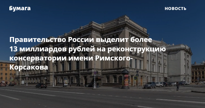 9 декабря правительство РФ решило направить Петербургу 3 миллиарда рублей для окончания шестилетней реконструкции консерватории Римского-Корсакова. Деньги поступят из резервного фонда в этом году, чтобы можно было заключить контракты на проектные и строительные работы, обещают чиновники.
