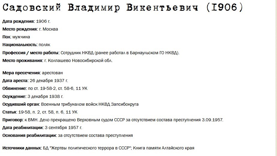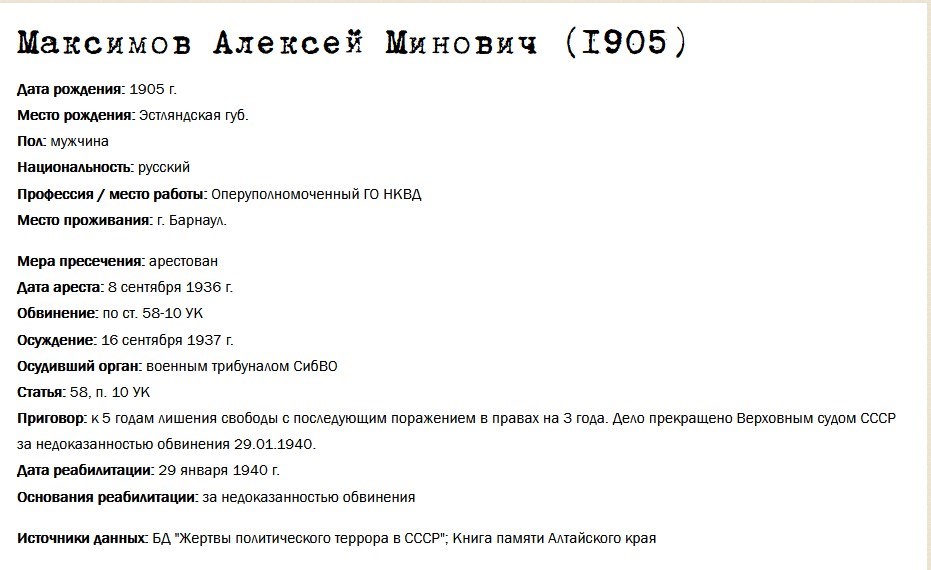 Фото: ru.openlist.wiki Другой бывший оперуполномоченный УНКВД Алексей Максимов сидел со мной в камере в 1937 году. О его деле мне известно следующее. Арестовали группу железнодорожников на станции Рубцовка, и чтобы дело было «красивым», нужно было, чтобы в нем был и сотрудник УНКВД. Максимов до органов работал в Рубцовке машинистом. Некоторые арестованные его знали. В доносе одного осведомителя Максимов якобы тоже являлся участником контрреволюционной троцкистской организации. Максимову было известно, что того осведомителя при вызове подписывать протоколы, в том числе и при подписывании готового отпечатанного протокола на Максимова, поили в кабинете пивом, носили из ресторана обеды, завтраки и ужины.