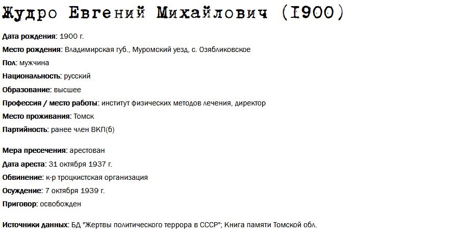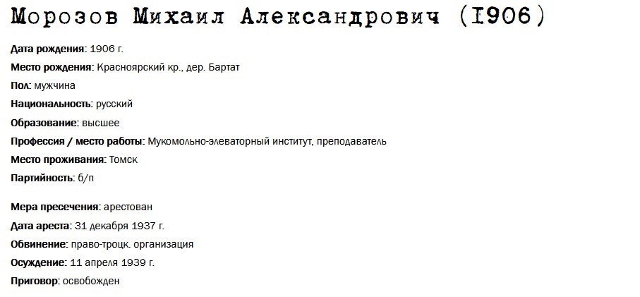 Фото: ru.openlist.wiki Арестованный научный работник томского мукомольского элеваторного института Михаил Морозов рассказал, что когда вызвали на допрос в Томский ГО НКВД, то сотрудники Пучин и Миронов несколько дней его держали на конвейере и на выстойке. Ругали и избивали, требуя от него, чтобы он писал показания на себя. Он отказался писать такие показания, мотивируя тем, что он никем не завербован и никакую контрреволюционную работу он не проводил и ничего не знает. Тогда Миронов ему заявил, что составит акт, что он, Морозов, отказался писать показания и что его по этому акту расстреляют. До вызова на допрос Морозов был посажен в камеру, где сидели арестованный поп. И тот рассказал Морозову, что на допросе нужно подписывать все, что требует следователь, тогда по суду можно получить срок, а если отказываются подписывать, то следователь составляет акт на арестованного, и по этому акту как «несознавшегося» его расстреляют без суда.