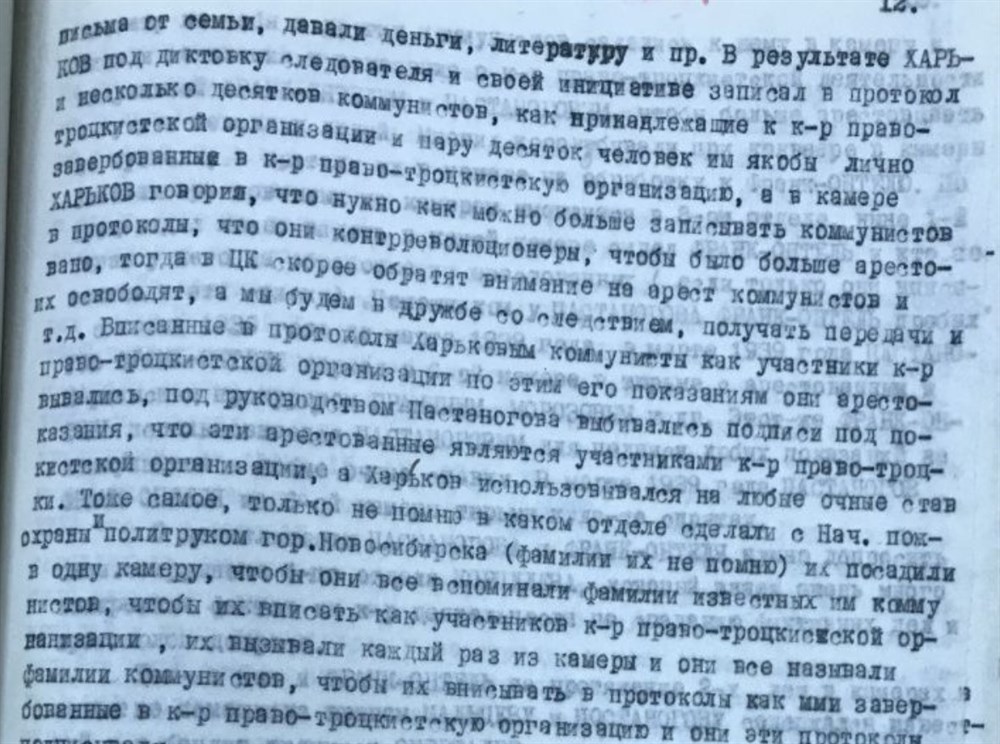 В настоящем заявлении я излагаю вам известные мне следующие факты. В УНКВД по НСО под руководством врагов начальников УНКВД Григория Горбача и Ивана Мальцева, начальника 4-го отдела Константина Пастаногова, начальника 1-го отделения 4-го отдела Михаила Длужинского занимались политическим вредительством, применяли к арестованным пытки и методы «следствия», позорящие органы НКВД и являющиеся контрреволюционной деятельностью против генеральской линии партии.