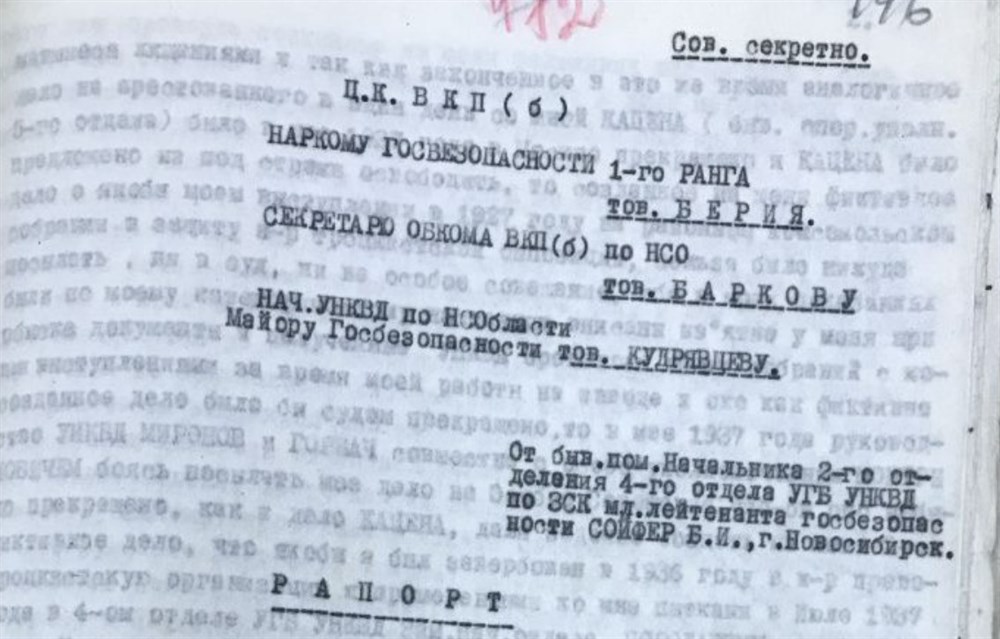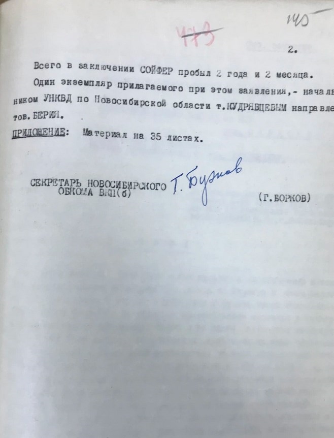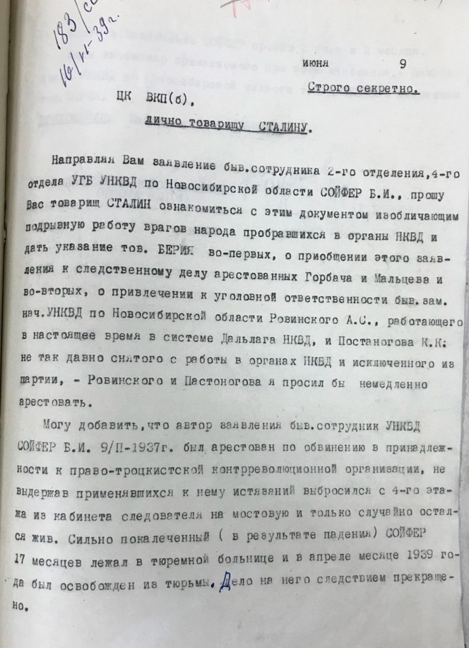 Страница рапорта Бориса Сойфера Фото: музей "Следственная тюрьма НКВД" Во время допроса и пыток Борис Сойфер выбросился с четвертого этажа здания УНКВД и сломал позвоночник. Его положили в тюремную больницу, где он и находился до 1939 года. Этим он спас себя от конвейерных допросов и пыток и остался жив. Его освободили 26 марта 1939 года из Новосибирской тюрьмы. После освобождения он написал рапорт наркому Лаврентию Берии и секретарю Новосибирского обкома ВКП(б) Геннадию Боркову о «методах следствия» в УНКВД Новосибирска. Рапорт был размещен на сайте «Таловская трагедия», посвященном репрессиям в Тайгинском районе Западно-Сибирского края, и на сайте музея «Следственная тюрьма НКВД». С небольшой правкой рапорт публикуется в рамках совместного с музеем проекта «XX век. Очевидцы».