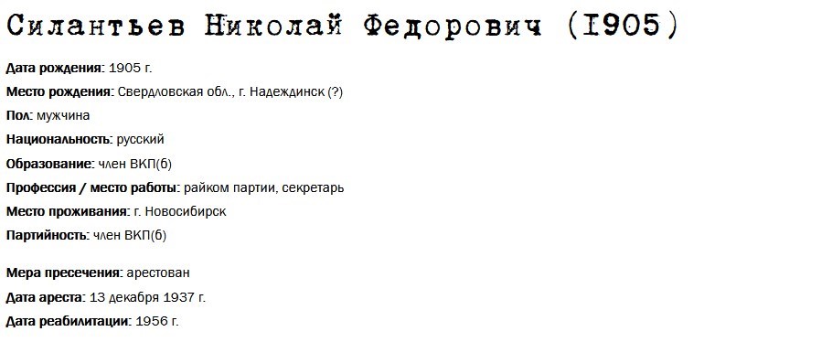 Арестованный бывший секретарь Октябрьского райкома ВКП(б) города Новосибирска Николай Силантьев рассказал мне, что он работал инструктором в одном из райкомов партии города Москвы. Его жена Фрумкина в конце 1936 года была направлена в Новосибирск на работу в крайком ВКП(б), и вместе с ней приехал в Новосибирск и Силантьев. В Новосибирске он работал вторым секретарем райкома ВКП(б), а в 1937 году он был избран первым секретарем райкома.