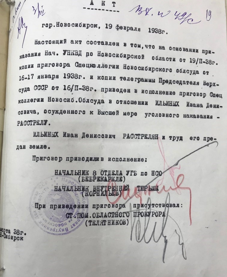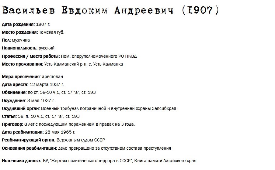 Иван Ольшанский Фото: myisk.net Еще одно дело Ольшанский завел на оперуполномоченного Усть-Калманского района Евдокима Васильева. Васильев рассказывал, что в конце 1936 года был на курорте возле Ленинграда. Им принесли газеты с приговором над Московским контрреволюционным троцкистским центром. В их компании было семь человек, и когда они их прочли, то начали говорить, в том числе и он, что вот сволочи, какими гадами они оказались, очень хорошо, что суд вынес им такой жесткий приговор. Позже в санатории, перед сеансом в кино, он поспорил из-за девушки с двумя милиционерами, которые тоже там отдыхали и тоже сидели на скамейке, когда обсуждали приговор. В ходе ссоры милиционеры ему сказали: ты нас будешь помнить. Через три месяца после приезда с курорта его вызвали в Новосибирск и арестовали по поступившему от милиционеров заявлению. В нем говорилось о том, что якобы, когда читали приговор, Васильев восхвалял Григория Зиновьева. Говорил, что тот когда-то был председателем Коминтерна и у него были свои труды по истории партии. Сам Васильев этого разговора не отрицал и сказал, что говорили о том, кто и где из осужденных ранее работал. Сам Васильев сказал о некоторых, в том числе и о контрреволюционном бандите Зиновьеве, что тот как раз был снят с должности председателя Коминтерна. И что его история партии была как контрреволюционная изъята. И начал спорить с одним из милиционеров, который позже и написал заявление.