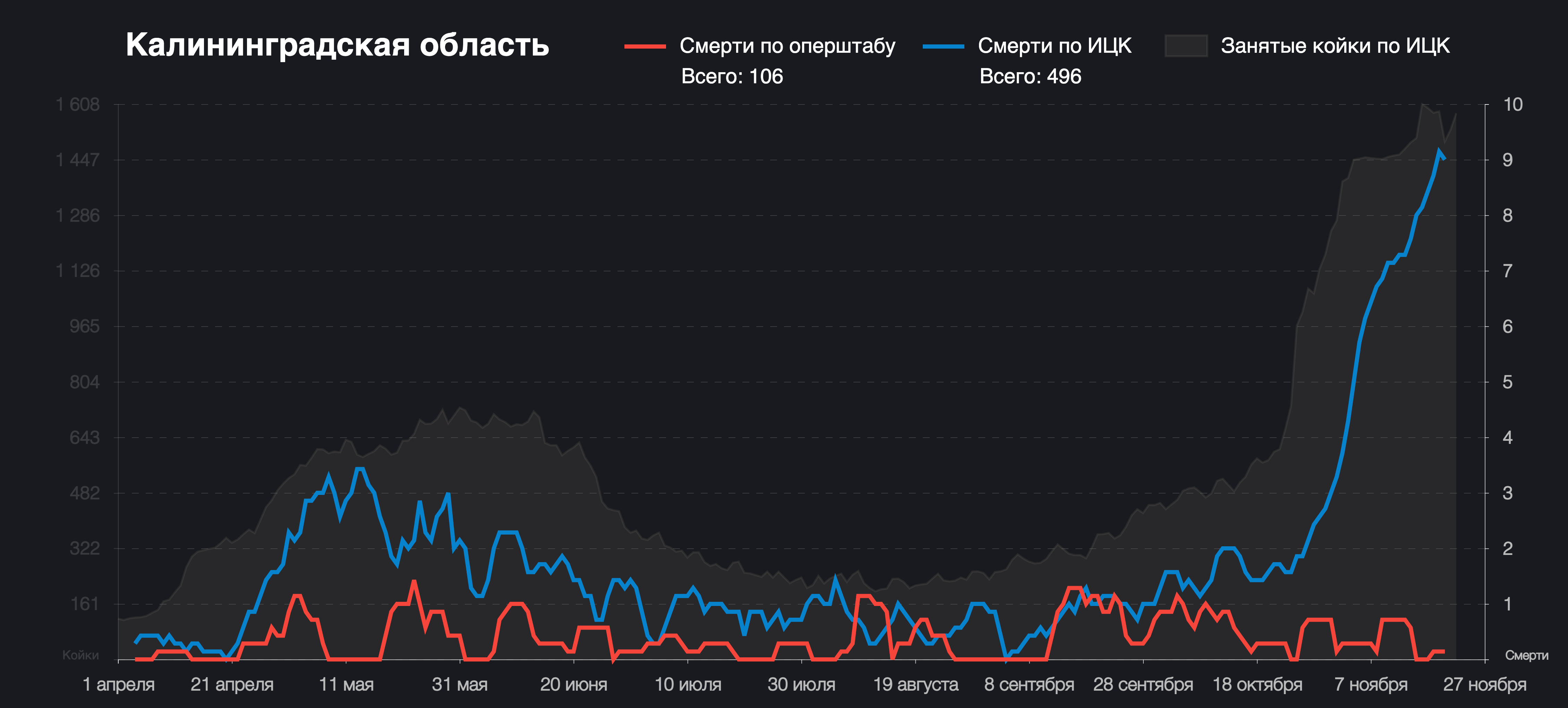 Места в больницах заканчиваются. С начала осени постоянно растет число заболевших, всю неделю в регионе фиксировали более 200 новых случаев каждый день. Замглавы Минздрава России Михаил Мурашко называл ситуацию в Калининградской области «тревожной» из-за загруженности коечного фонда. Сейчас в регионе заняты уже 90% коек для больных COVID-19 — из 2 052 коек занято 1 827.