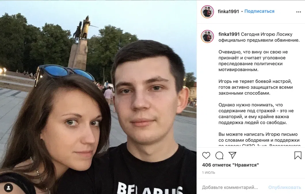 28-летнего блогера задержали в Барановичах 25 июня после обыска. Во время оперативных действий жене и полуторагодовалой дочери Лосика пришлось в течение нескольких часов сидеть в подъезде. На тот момент у телеграмм-канал «Беларусь головного мозга», который рассказывал о локальных проблемах страны, подготовке к грядущим выборам президента Беларуси и вспыхнувших акциях протеста, было более 167 тысяч подписчиков. Сейчас их в два раза больше.