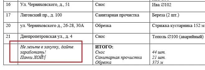 Некоторое время назад петербургское муниципальное казенное учреждение по оказанию муниципальных услуг «Лиговка-Ямская» разместило закупку на санитарную обрезку и вырубку деревьев на сумму 865 000 рублей. В документации по закупке шрифтом белого цвета приписано: