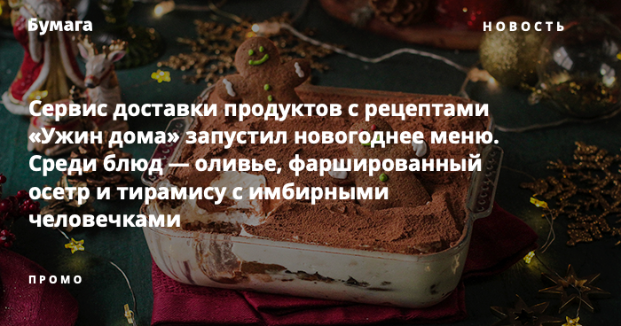 В декабре сервис доставки продуктов с рецептами «Ужин дома» представил новогоднее меню из 25 ресторанных блюд: среди них — самые популярные позиции прошлого года и новинки. Кроме того, можно заказать блюда для январских каникул.