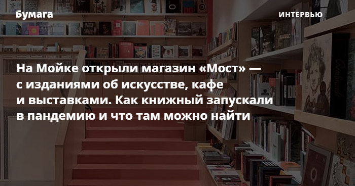 В ноябре на набережной Мойки, 58 открыли книжный магазин «Мост» — в неоклассическом доходном доме неподалеку от Красного моста. Здесь представлены книги об искусстве от Abberville, British Museum Press, Европейского университета, Strelka Press и других издательств.
