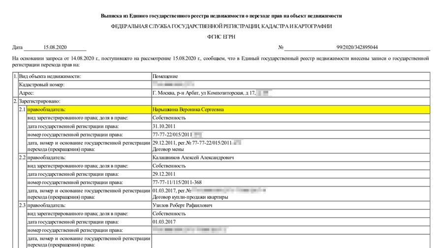 Человека, с которым она обменялась жильем, зовут Алексей Калашников. Как выяснил «Проект», это сотрудник «Мосазервинзавода», он очень близок к Байрамову: в базе данных ГИБДД мобильный телефон Калашникова привязан к Mercedes-Benz бизнесмена. В 2017 году Калашников продал квартиру на Арбате Роберту Узилову, земляку Нисанова из Красной Слободы — это один из владельцев площадей в ТЦ «Москва» в Люблино, принадлежащем «Киевской площади», и бывший член совета директоров рынка «Садовод». Кому достались деньги от продажи, неизвестно. Сам Калашников прописан в обычном доме в спальном районе — на Севастопольским проспекте.