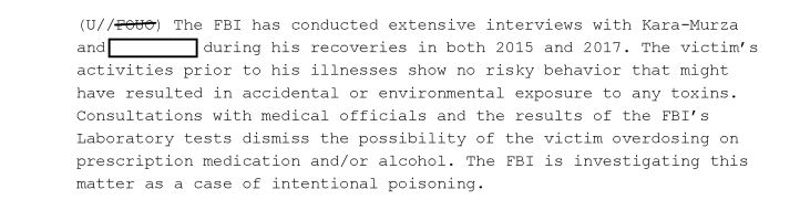 Кара-Мурза пролежал в московской больнице шесть недель. Когда его состояние стабилизировалось и его выписали, он с женой Евгенией вернулся домой в США. Источник, имя которого в документах вымарано, предоставил ФБР для анализа футболку Кара-Мурзы со следами рвоты, нижнее белье, пробирку с обрезками волос и ногтей, а также пузырек "с чем-то похожим на кровь".