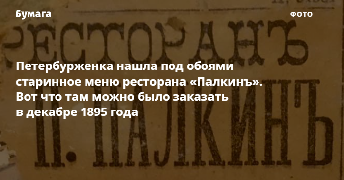 Петербурженка Евгения Кулакова рассказала в фейсбуке, что нашла под обоями меню ресторана «Палкинъ» от 17 декабря 1895 года.